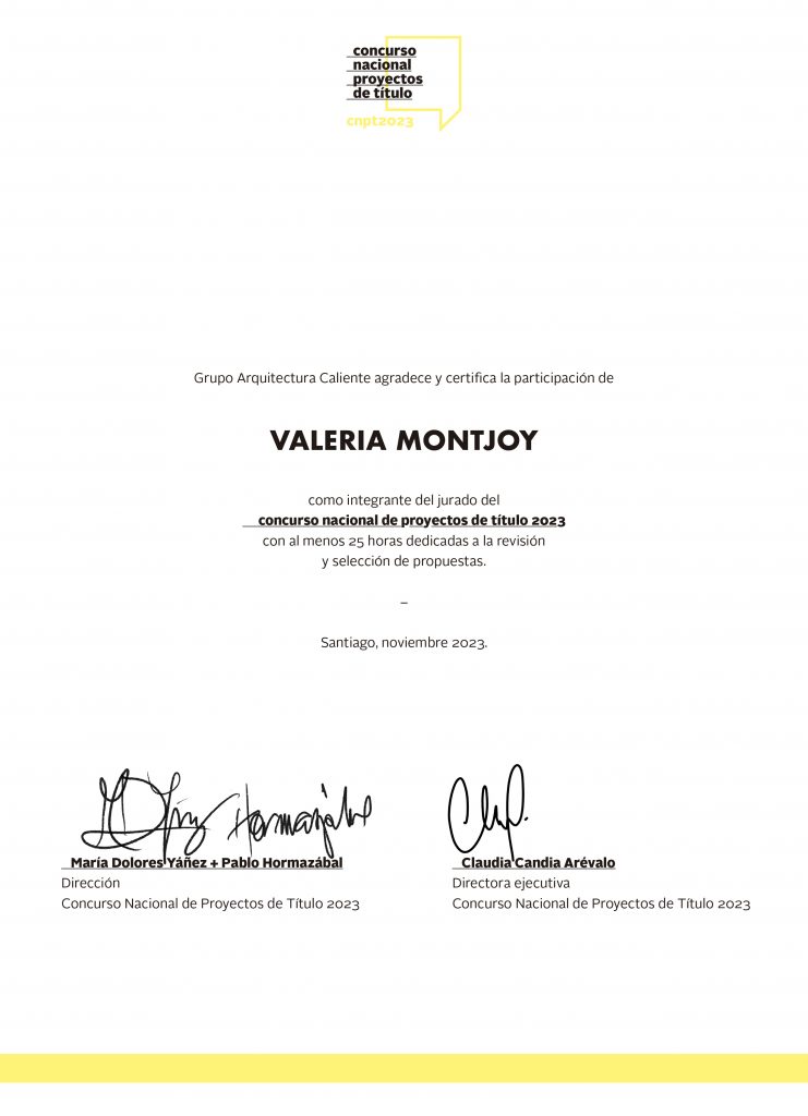 Selected as the youngest jury member in Chile’s National Thesis Competition, evaluating 141 projects from every architecture school in the country (2023).